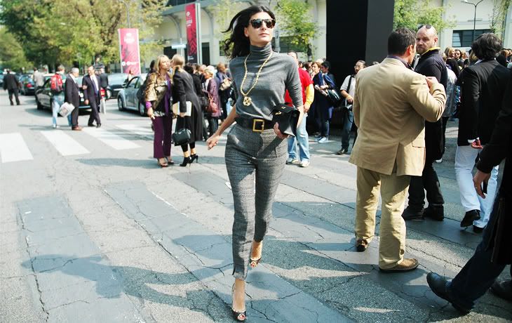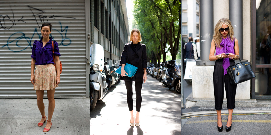 I'm not one for a lot of colour, but these pictures from the shows may change my mind yet. Not a huge fan of Zoe but I love her outfit; the purple is jewel bright and the trousers... well we all know how much I love black trousers, hehe. And I definitely need a jewel coloured silk blouse like the gorgeous girl on the left. I love the combination of the darker shirt with the light skirt; usually it's the other way around. The girl in the middle is in the uniform de rigueur, i.e. black but I love the oversized clutch - it's the Marc by Marc Jacobs Airliner Magazine clutch in the turquoise Foam colour... yes perhaps it is sad that I can ID a bag.